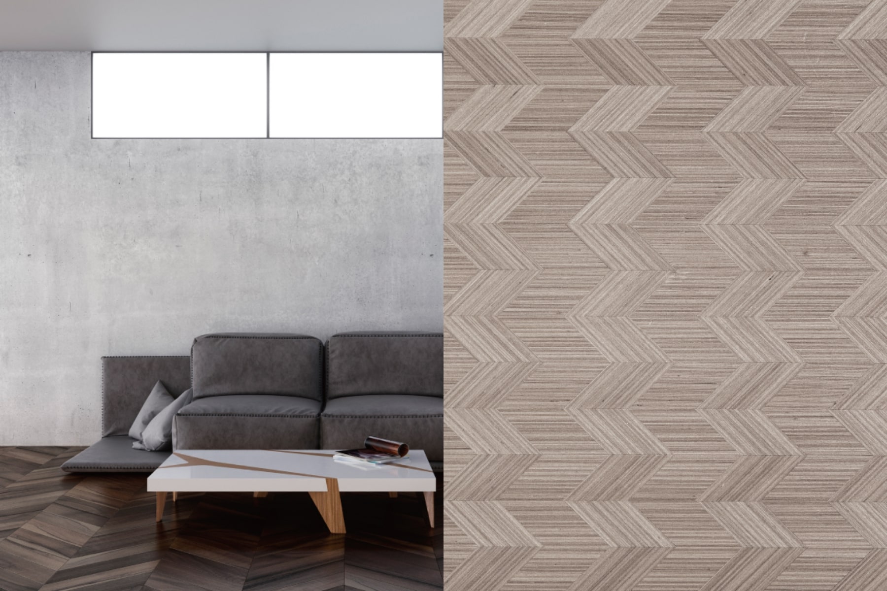 加工を施すことで生まれた変化のある木目表面を再現し、柄構成や色合いを工夫することでモダンな意匠に仕上げた。
