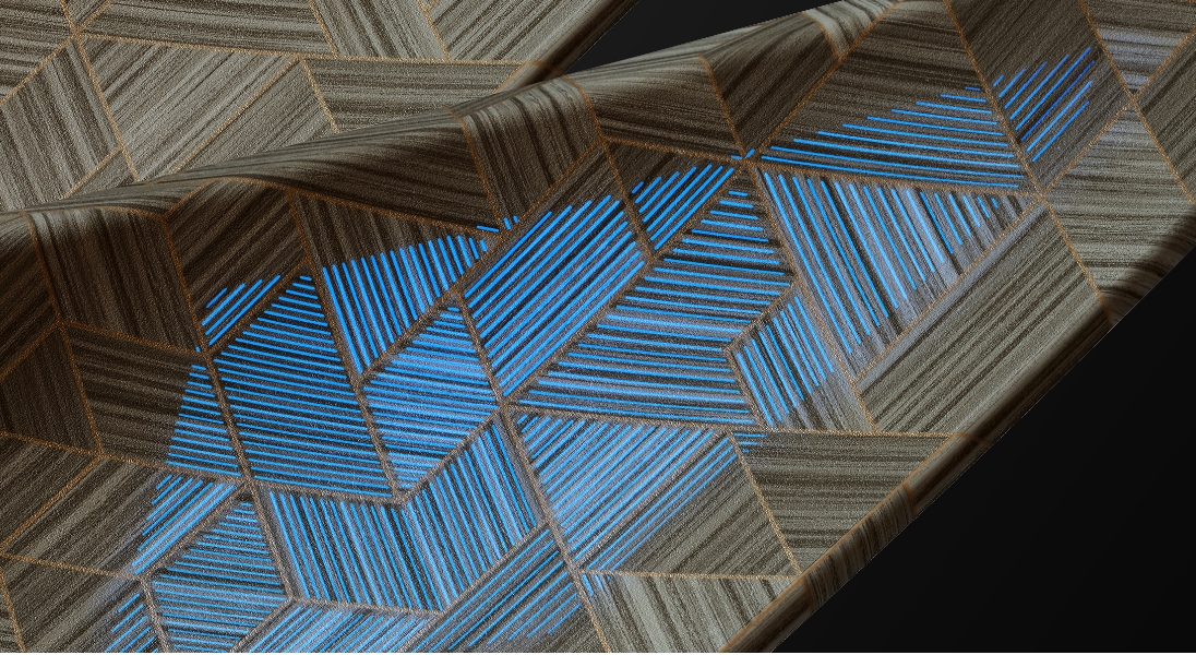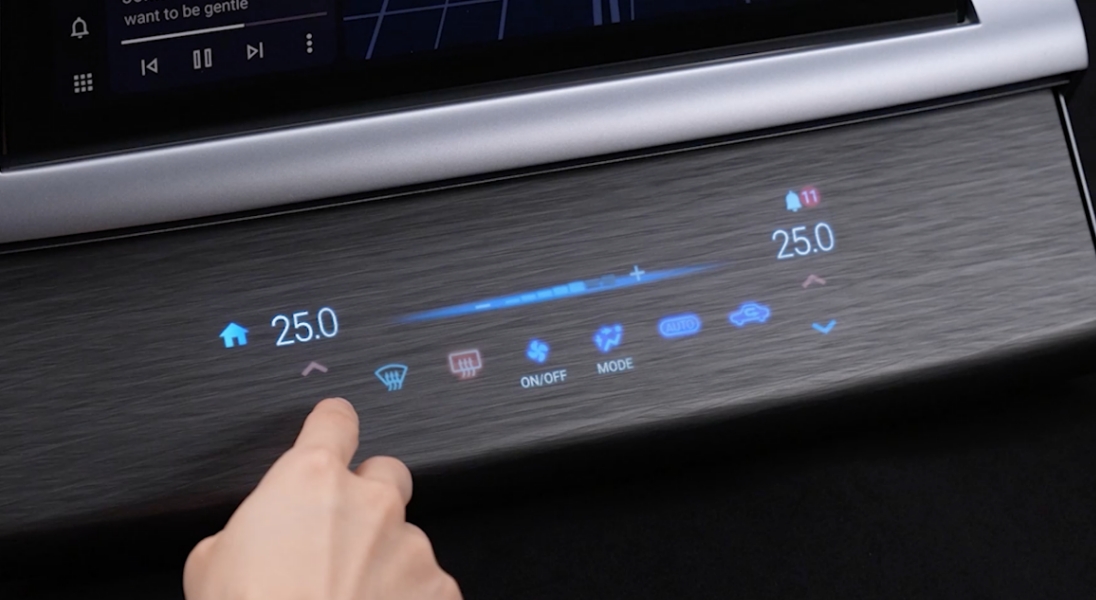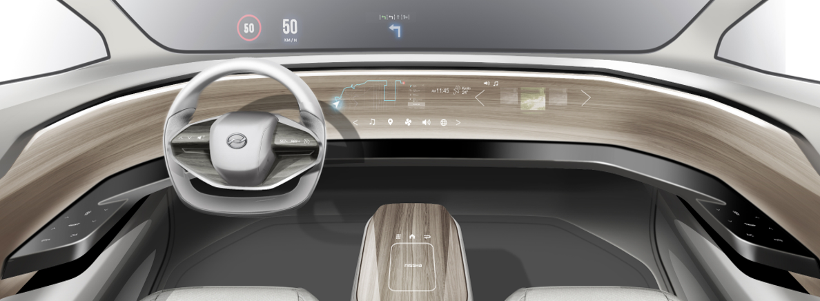 By combining decorative film with a light‑controlling layer, our interior trim surface maintains a calm, seamless appearance in the OFF state, selectively revealing displays, icons and ambient lighting graphics only when illuminated. This approach allows the material expression itself to remain the focus, while light-based cues appear only when intended, without compromising the overall aesthetic of the trim surface.
