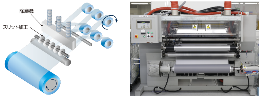 選定基準で挙げた項目(スリット刃条件と集塵、張力・蛇行制御、ESD対策)を、“一連の工程”としてつなげられる点がメリットです。包装も含めた導線設計、切断面の局所排気と帯電管理などお客さまの要望に沿った設計で進めることができます。